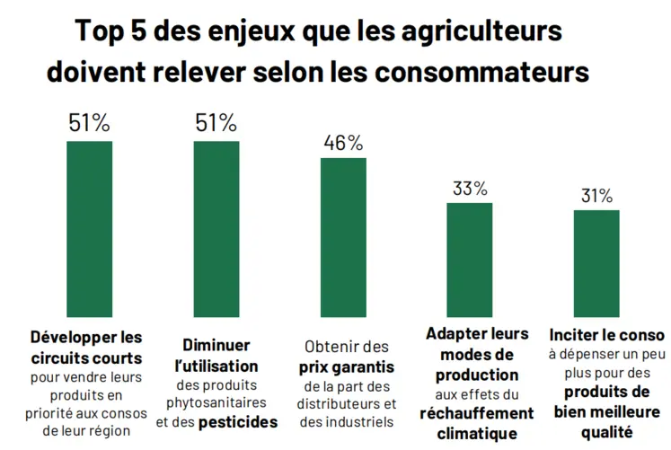 Pour l'avenir, les priorités fixées par les consommateurs pour améliorer la situation sont claires : le développement des circuits courts pour vendre en priorité aux consommateurs de leur région (51 %) ; la diminution de l'utilisation des pesticides et produits phytosanitaires (51 %) ; l'obtention de prix garantis de la part des industriels et distributeurs (46 %).