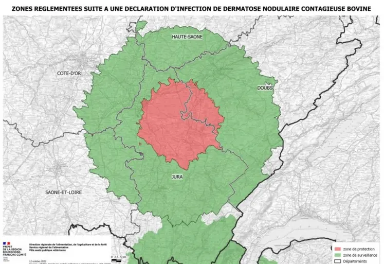 Après la confirmation d'un premier cas de dermatose nodulaire contagieuse le 11 octobre dans le Jura, une quatrième zone…
