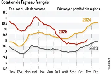 La cotation des agneaux a augmenté de 0,15 euros le kilo fin novembre, mais reste sous le niveau de 2024.