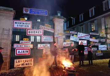 Les panneaux des communes accrochés aux grilles de la préfecture à Guéret