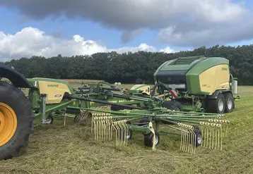 Krone - La presse à balles rondes attelée derrière l’andaineur à double rotor