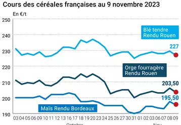 L’évolution des cotations des céréales françaises (blé, orge, maïs) entre le 8 et le 9 novembre 2023,…