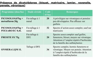 La stratégie de désherbage en sortie hiver doit être raisonné en fonction de la flore présente et de leur densité de peuplement au sein de la parcelle (voir les deux tableaux sur les dicotylédones, ray-grass et/ou vulpin).