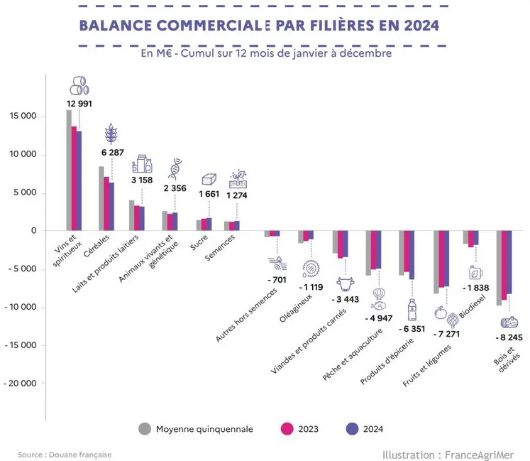 La balance commerciale des produits agricoles et agroalimentaires de la France, bien que toujours excédentaire de 3,9 Md€, s’est encore repliée en 2024 (- 26 %) avec un recul du solde positif des échanges avec les pays tiers (- 16 %) et une quasi-stabilité du déficit avec les pays de l’Union européenne.