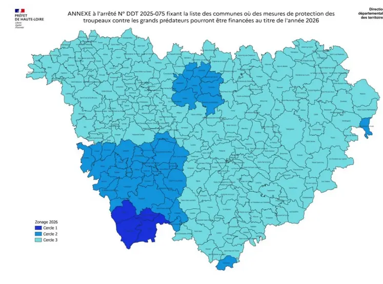 L’arrêté préfectoral N°DDT 2025-075 du 29 décembre 2025 définit les communes et les conditions dans lesquelles les agriculteurs sont éligibles à une aide financière pour mettre en place des mesures de protection contre la prédation du loup sur les troupeaux ovins et caprins. Il concerne toutes les communes de Haute-Loire, réparties en 3 zones (appelées cercles).