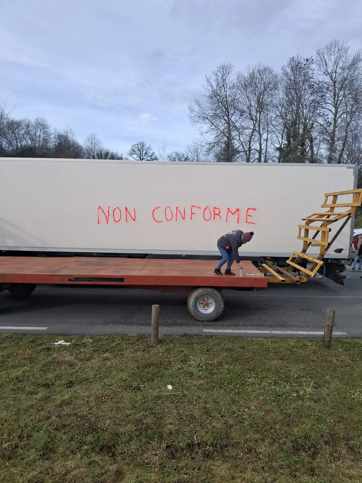 À La Croisière, à l’entrée de la RN 145, une cinquantaine d'agriculteurs tenaient le barrage filtrant et ont contrôlé une trentaine de camions. Au sein des cargaisons contrôlées, ils ont trouvé du jambon blanc sous-vide d’origine danoise ou espagnole, jugé non conforme à leurs critères. Les marchandises ont été déchargées et détruites, dans une opération symbolique dénonçant la menace sur l’agriculture locale.