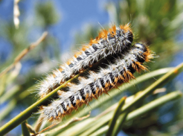 La processionnaire du pin se rencontre principalement sur les résineux. Elle mesure de quelques millimètres à environ 4 cm et se reconnaît à sa tête noire et lisse, ainsi qu’à son corps foncé, couvert de poils orangés sur le dos et blanchâtres sur les côtés. Ses soies urticantes apparaissent à partir du troisième stade larvaire et sont particulièrement dangereuses dans notre région entre mi-février et mi-mai.