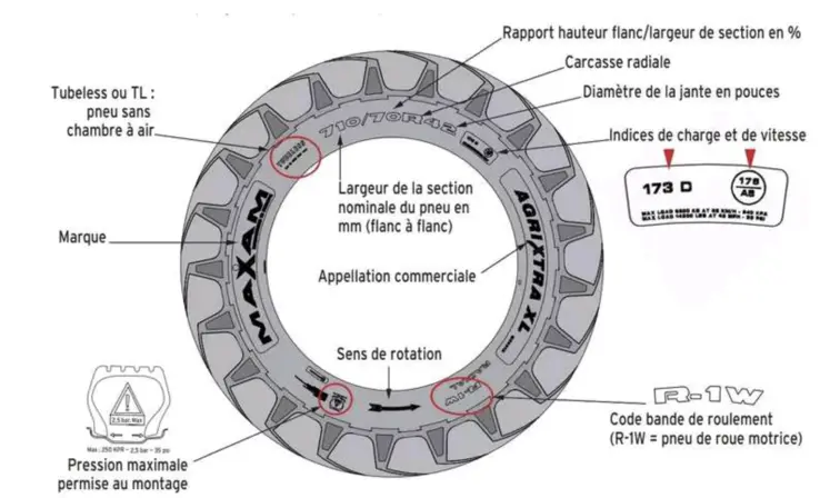 Attention : Avant de faire son choix de pneus, il est important de consulter les données du constructeur ou de se rapprocher de son concessionnaire pour respecter la prépondérance. Un changement de pneus, notamment de dimension, peut entraîner un problème de synchronisation entre les roues avant et arrière, ce qui peut se traduire par une usure prématurée ou un risque de casse sur le tracteur.