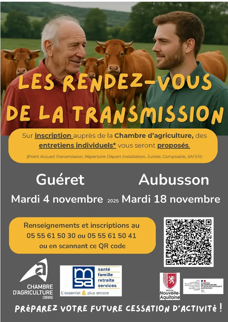 En partenariat avec la MSA du Limousin, les « Rendez-vous de la Transmission » auront lieu le mardi 4 novembre à Guéret et le mardi 18 novembre à Aubusson.