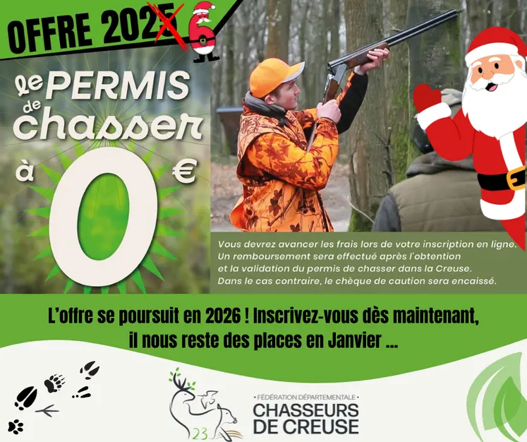 La Fédération Départementale des Chasseurs de la Creuse confirme la reconduction, pour 2026, de son dispositif exceptionnel Permis de chasser à 0 €. Une initiative devenue emblématique, qui permet chaque année à de nouveaux candidats de découvrir la chasse grâce au remboursement intégral des frais d’inscription à l’examen, sous réserve d’une première validation réalisée dans le département.