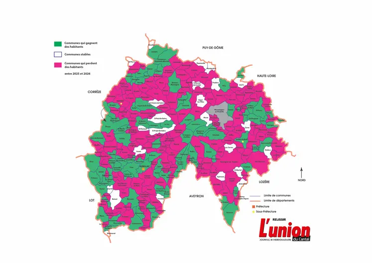 La comparaison 2026 vs 2025 fait apparaître des trajectoires infradépartementales différentes : 133 communes enregistrent une baisse démographique, 24 restent stables, 88 gagnent des ressortissants. Dans le Top 5 de celles qui gagnent le plus d’habitants, en valeur absolue : la Petite Nice du Cantal, Maurs (2174, + 43) qui ne ménage pas ses efforts en termes
