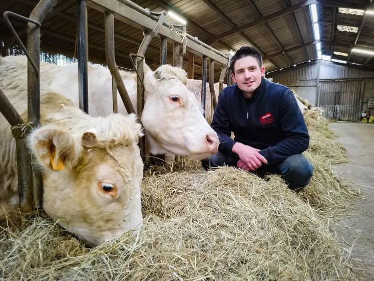 Adrien Lhommet s'est installé sur l’exploitation familiale en 2019, après la reprise des parts de sa mère partie à la retraite. Aujourd’hui en Gaec avec son père, ils élèvent 125 vaches allaitantes Charolaises sur une SAU totale de 200 ha (dont 15 ha de céréales autoconsommées).