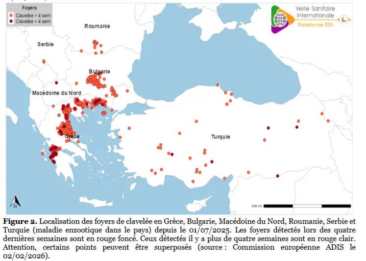 Historiquement présente en Afrique, au Moyen-Orient et en Asie, la clavelée a réémergé en Europe ces dernières années. Plusieurs pays ont signalé des foyers, notamment la Grèce, avec une augmentation marquée des cas depuis 2023, et une diffusion dans différentes régions. Des épisodes ont également été rapportés dans d’autres États du sud-est de l’Europe et en Espagne, illustrant le risque de diffusion transfrontalière.