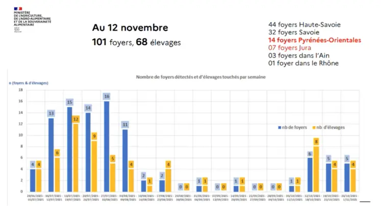 Au 12 novembre, la France comptait 101 foyers répartis dans 68 élevages de six départements. Les Savoie (aujourd’hui zone “éteinte”) représentaient 77 foyers, les Pyrénées orientales 14 (zone encore chaude), le Jura 7 (zone jugée tiède), l’Ain 3, le Rhône 1. On ne compte “plus” aujourd’hui que trois zones réglementées, les deux autres (Savoie et périphérie + une partie du Rhône) sont passées en zone vaccinale.