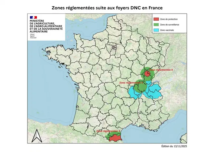 Lors d'un webinaire organisé par la FNSEA et les JA le 13 novembre, Olivier Debaere, directeur de projet chargé des épizooties, directeur de crise et inspecteur en chef de la santé publique vétérinaire à la DGAL (direction générale de l’agriculture et l’alimentation, ministère de l’Agriculture), a détaillé la situation de la DNC dans l’Hexagone et la stratégie en termes d’éradication, de vaccination et d’export.