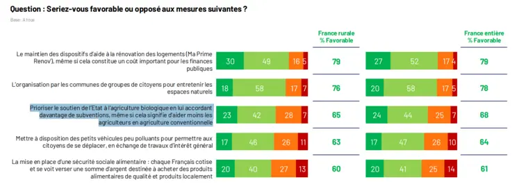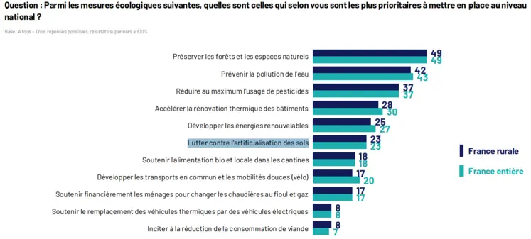 La préservation des espaces naturels (respectivement 60 % et 57%) et la rénovation énergétique des bâtiments (47% et 50%) sont les mesures écologiques à prendre pour les deux catégories de population. Selon elles, il est aussi impératif de préserver les forêts et les espaces naturels (49 % dans les deux cas), prévenir la pollution de l’eau (42 % et 43 %) ou réduire au maximum l'usage de pesticides (37 % pour les deux populations) et ils sont 23 % chez les ruraux et dans le reste de la population à estimer prioritaire la lutte contre l'artificialisation des sols. Mais ils ne sont respectivement que 8 % et 7 % à être en faveur de réduire la consommation de viande.