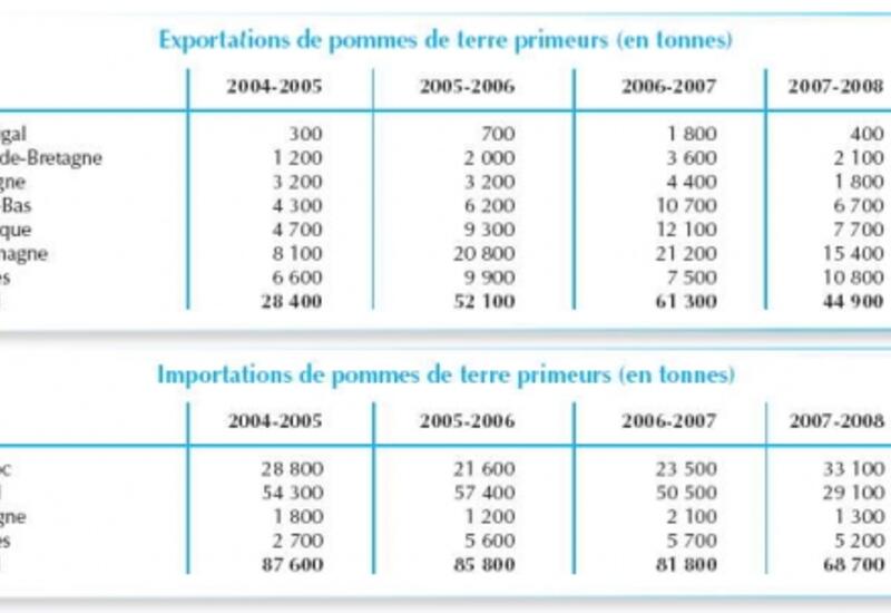 Pour cette campagne 2007-2008, du 1 er janvier au 30 juin 2008, les exportations françaises en pommes de terre primeurs se sont élevées à 44 900 tonnes, contre 61 300 tonnes en 2006-2007 et 52 100 tonnes en 2005-2006 sur la même période.