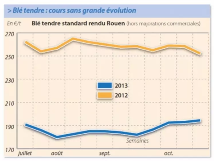 Les cours ont peu évolué sur la semaine. Les conditions météo peu propices à la réalisation des semis sur la zone mer Noire, préoccupent le marché et entretiennent un fond de fermeté. En France, même s’il est encore un peu tôt pour que le phénomène touche le marché, certains opérateurs s’inquiètent des conséquences du retard de la récolte de maïs, qui pourrait décaler les semis de blé. Notons également la bonne demande mondiale sur la scène internationale, qui participe au maintien des cours. À ce sujet, les importations de blé chinoises n’excèderaient pas 5 Mt cette année selon le Cofco, alors que les opérateurs attendaient un niveau plus élevé. Par ailleurs, la situation de blocage de l’administration aux États-Unis a trouvé une sortie avec la décision du Congrès de relever le plafond de la dette. Ainsi l’USDA devrait reprendre ses activités. Selon un communiqué du 17 octobre, le rapport sur l’offre et la demande mondiales du mois d’octobre ne sera pas diffusé. Le prochain devrait paraître le 8 novembre.