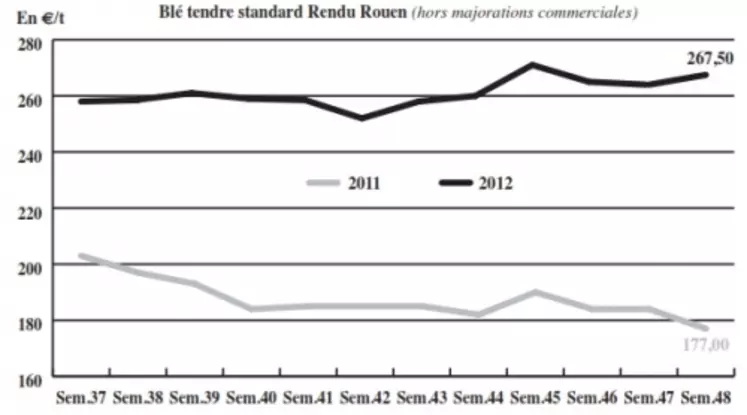 Le marché se consolide dans le sillage de Chicago. Ce dernier est soutenu par les mauvaises conditions de culture du blé d’hiver outre-Atlantique. Le bon niveau des exportations US enregistré la semaine dernière participe à cette fermeté. Les blés français pourraient bénéficier eux aussi de la moindre présence de l’origine mer Noire sur le marché mondial. Et ce d’autant que l’euro repart à la baisse, l’accord sur la dette grecque n’ayant pas suffisament rassuré les marchés. L’Algérie a, à ce propos, lancé un appel d’offres pour 50.000 t de blé tendre. L’activité commerciale est globalement calme. Le portuaire ne se montre pas très dynamique. Pour l’instant… Car les opérateurs se préparent tout de même à la relance des exportations pour la seconde partie de campagne 2012/2013. Les primes ont eu tendance à se replier. Le débouché nutrition animale, actuellement aux achats, est plus rémunérateur pour les vendeurs. Quelques affaires à destination du nord-UE sont rapportées. Du côté des meuniers, des affaires sont réalisées pour des compléments sur la deuxième moitié de campagne. La demande espagnole se réveille et profite aux vendeurs du Sud-Ouest. De manière générale, les acheteurs ne s’engagent pas sur de gros volumes, ni sur l’éloigné, le marché étant trop incertain et particulièrement ferme. Sur le marché mondial, on notera l’achat soudanais de volumes en provenance d’Australie, montrant la compétitivité de cette dernière sur le continent africain. Selon CéréObs', au 19 novembre, les semis de blé tendre ont progressé à 94% contre 100% en 2011. Quelque 72% des cultures ont atteint le stade levée.