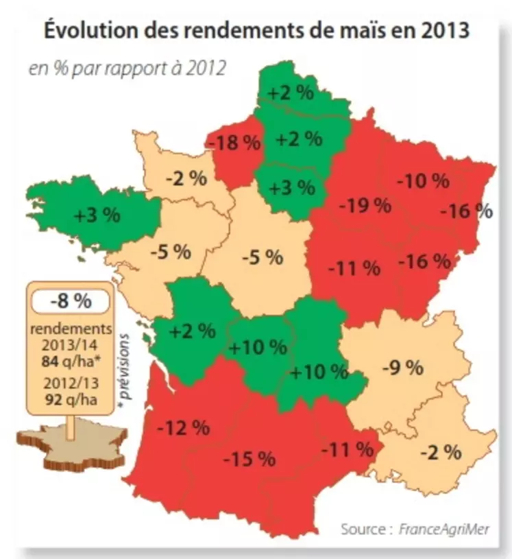 FranceAgriMer a révisé à la baisse la production hexagonale de maïs-grain à 15,2 Mt (-230.000 t), en raison d’un recul des rendements (cf. carte) et de moindres surfaces récoltées, avec un probable report vers du maïs-ensilage. « Malgré la compétitivité du maïs par rapport au blé, nous n’avons pas rehaussé les utilisations des Fab (3,7 Mt), car nous attendons de voir les progrès de la récolte et les conditions de sa commercialisation », expliquait Olivia Lelamer, chef de l’unité Grandes cultures chez FranceAgriMer, lors du point Céréales du 13 novembre. Avec 50 % de la récolte effectuée au 4 novembre, les travaux ont 28 jours de retard par rapport à 2011. « Actuellement, les sols sont saturés en eau. Tout va dépendre de la météo et de la praticabilité des sols. » De même, l’Allemagne va sûrement enregistrer une baisse de sa production de maïs-grain, avec une conversion vers la production d’ensilage ou de biogaz.