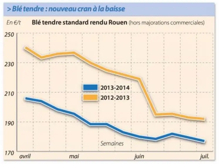 Les bonnes perspectives de production européennes, accompagnées par une météo jusqu'ici favorable aux cultures, participent à la baisse des cours imprimée par Chicago. La publication du rapport de l'USDA du 30 juin (cf. ci-contre), a en effet pesé sur le marché européen. Les pluies viennent néanmoins freiner le démarrage des opérations de récolte, notamment dans le Sud.