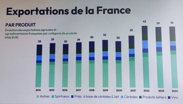 « [En 2024], la France, malgré un léger rebond de ses exportations [agricoles et agroalimentaires] (+1 %) voit son excédent commercial réduit de 3 milliards d’euros loin des sommets atteints en 2022 (année de reprise post-pandémie couplée à une forte inflation) », constate Philippe Marrec, directeur du département Info-Conseil de Business France, dans l’édito de son livre blanc "Où exporter ? Agro". Ce guide de l’agence nationale au service de l’internationalisation de l’économie française propose « une analyse approfondie des échanges mondiaux agricoles et agroalimentaires et une mise en lumière des filières clés de l’offre française », qui se veut être un outil au service des entreprises pour consolider leur présence à l’international, « dans un contexte désormais marqué par des incertitudes climatiques, géopolitiques et économiques en passe de devenir la norme ».