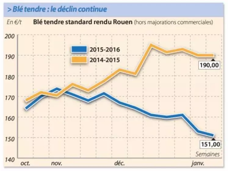 Des volumes mondiaux importants, une demande en berne, associée à une conjoncture peu porteuse, expliquent le nouveau retrait des prix du blé tendre observé cette semaine. Le rapport de l'USDA, publié mardi, a permis une courte stabilisation des cours en début de semaine, avec le retrait des surfaces en blé d'hiver US Récolte 2016 (HRW à 26.5 millions d'acres contre 28.978 Ma l'an dernier, SRW à 6.72 Ma contre 7.087 Ma). Mais les stocks mondiaux de blé 2015/2016 ont été corrigés à la hausse à 232 Mt. Dès le lendemain, les prix sont repartis à la baisse, toujours pénalisés par la situation économique dégradée en Asie, sus-citant des craintes quant à la demande à venir. La baisse des prix du pétrole n'a pas arrangé les choses. Enfin, les chiffres du bilan de campagne présentés par FranceAgriMer jeudi, ont enfoncé le clou. D'autres éléments comme le retour de l'Argentine sur le marché mondial avec la baisse des taxes à l'export, participent à cette baisse. Concernant l'activité, le marché se réveille en Bretagne à la faveur d'un recul des primes, permetant quelques échanges en blé fourrager. Déjà bien couverts sur l'ensemble de la campagne, les meuniers sont, quant à eux, inscrits aux abonnés absents. Sur la façade Atlantique, si on enregistre un petite activité sur le rendu La Pallice, les transactions sur le port de Bordeaux sont rares. Sur Rouen et Dunkerque, l'activité est routinière. Peu de demande donc, mais pas plus d'offre, les prix n'étant plus rémunérateurs pour les producteurs.