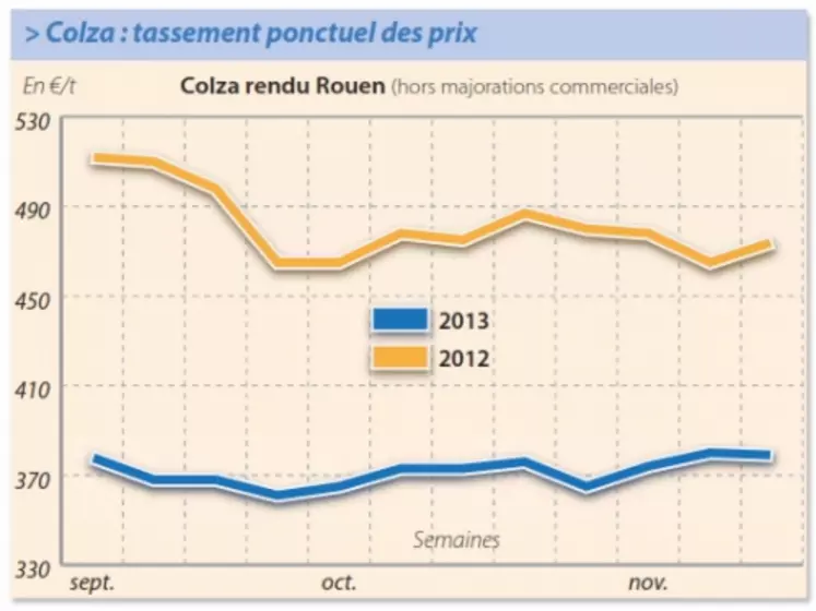 Les cours du colza se sont repliés en début de semaine dans le sillage de la graine US. Les cours du soja ont été tirés vers le bas par l’attente de récoltes abondantes en Amérique latine. La possible révision du mandat biodiesel des états-Unis par l’Agence de protection de l’Environnement (EPA) a également pesé sur les prix. Enfin, les agriculteurs US sont poussés à vendre leurs marchandises, faute de capacités de stockage suffisantes. Si la tendance du complexe oléagineux est globalement baissière sur la semaine, les cours se sont quelque peu raffermis à partir du mercredi. La graine US est soutenue par le rythme des exportations du pays. En trois mois, les états-Unis auraient déjà quasiment exporté ce que l’USDA prévoyait pour toute l’année. Les ventes US de soja sur la campagne 2013/2014 sur la semaine achevée au 17 octobre, se sont révélées deux fois supérieures aux attentes, à 1,376 Mt dont 1,152 Mt à la Chine. L’annonce de Bruxelles de l’application de droits anti-dumping définitifs sur le biodiesel argentin et indonésien à partir du 27 novembre, a participé au rebond du colza.