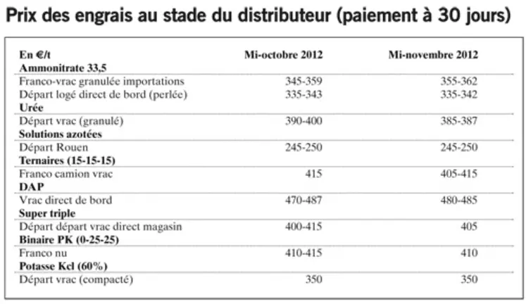 Selon les dernières statistiques de l’Unifa (Union des industries de la fertilisation), à fin septembre, le retard des engrais azotés livrés en été s’est réduit alors que les livraisons d’engrais simples phosphatés et d’engrais composés PK progressent significativement par rapport à la campagne précédente (respectivement + 20 % et + 12 %). Néanmoins, l’azote livré recule encore de 5 % (et de 14 % si l’on se réfère aux trois dernières campagnes). L’Unifa estime cependant que, sur l’année civile, le retard important des livraisons d’azote devrait diminuer avec des perspectives 2013 encourageantes.