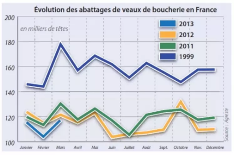 En moyenne entre juillet 2012 et janvier 2013, la consommation de viande de veau était 5,7 % sous son niveau de la même période un an plus tôt, selon FranceAgriMer. Ce repli s’est traduit par une baisse des sorties des ateliers d’engraissement, qui ont ainsi diminué de 5,2 % (soit 35.400 veaux) en cumul sur la période de neuf mois se terminant fin mars. Les abattages ont reculé de 7,1 % en février.
