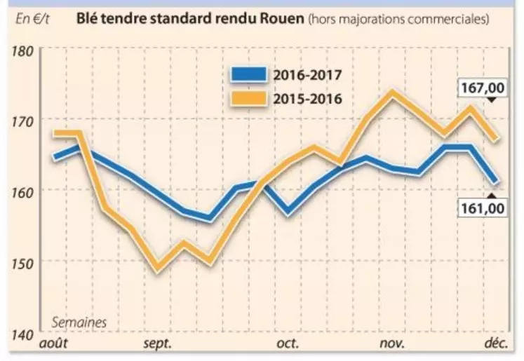 Les cotations du blé tendre ont observé un net retrait cette semaine sur Euronext et les places françaises, en raison de l'offre mondiale abondante et de la forte concurrence entre les principaux exportateurs mondiaux. La récolte australienne s'annonce record, projetée à 31-32 Mt pour 2016/2017. La demande internationale est bien présente. L'Égypte s'est procurée 240.000 t de marchandises russes, à 189 $/t Fob, en repli de 3,5 $/t par rapport au der-nier achat de produits russes du 11 novembre, témoignant de la bonne compétitivité de l'origine mer Noire. La Tunisie recherche-rait 109.000 t de blé meunier. Selon les services statistiques du ministère de l'Agriculture ukrainien, les stocks de blé tendre du pays au 1er novembre s'élèvent à 12,13 Mt, en repli de 16 % par rap-port à l'an dernier à pareille époque. En France, les opérateurs du marché rapportent l'arrivée sur la Bretagne de blé fourrager en provenance des pays baltes. Quelques affaires sont réalisées dans la région, les Fab ont besoin de matières premières et ils complètent leurs approvisionnements avant les fêtes. Dans le Sud-Ouest, la nutrition animale stimule aussi le marché, avec des demandes sporadiques venant de transformateurs espagnols. Côté meunerie, des affaires se traitent sur la seconde moitié de campagne. Dans les champs, Céré'Obs estime en semaine 47 les semis achevés à 99 %. Les conditions de cultures sont bonnes à très bonnes dans 94 % des cas (stables par rapport à la semaine passée, 97 % en 2015 à pareille époque). Le stade tallage est atteint dans 22 % des cas (53 % en 2015).