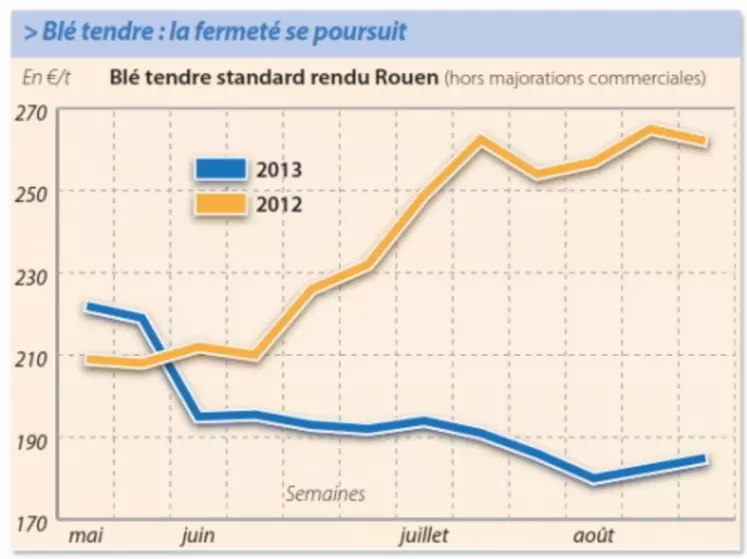 Le marché du blé se montre calme dans l’ensemble avec des cours soutenus, une majeure partie de la semaine, par le manque de pluies sur les zones de production de maïs et soja aux états-Unis. L’annonce de précipitations a logiquement détendu les marchés, les investisseurs débouclant leurs positions sur le marché à terme de Chicago. La perspective d’une bonne récolte allemande de blé est également de nature à peser sur les prix européens. En France, selon le dernier CéréObs’, la récolte de blé était réalisée à 100 % en semaine 34. Les classes bonnes à très bonnes sont stables à 67 % contre 72 % en 2012. Les demandes de l’industrie et de l’amidonnerie s’avèrent assez limitées dans l’est de la France. Les consommateurs du nord-UE se manifestent quant à eux pour des achats d’appoint. La meunerie interrogerait de son côté davantage, se positionnant même aux achats. Les meuniers espagnols affichent également leur intérêt, pour des commandes sur les longueurs essentiellement. Des affaires se traitent aussi régulièrement mais sans excès sur l’Ouest en blés fourragers. Sur le portuaire, l’activité est globalement calme, de nombreux opérateurs n’étant pas encore revenus de congés. Les offres françaises n’ont pas été retenues par Le Caire, qui a contractualisé, mercredi 25, 175.000 t auprès de l’Ukraine, 60.000 t à la Russie et autant à la Roumanie.