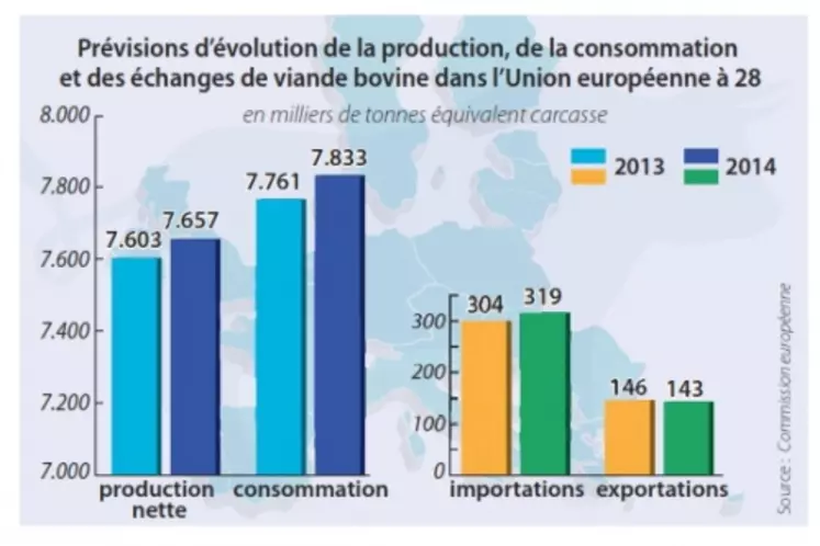 Selon la Commission européenne, la production indigène brute de l’UE à 27 serait en repli de 3,2 % en 2013 par rapport à 2012, mais de seulement 2,7 % pour les volumes véritablement disponibles en Europe. En cause, la chute des exportations de bovins vivants (-24,9 %), notamment vers la Turquie et la Russie. En parallèle, avec la baisse de près de 25 % des exportations de viande et la hausse de 10,6 % des importations, la consommation communautaire reculerait plus modérément (-1,6 %).