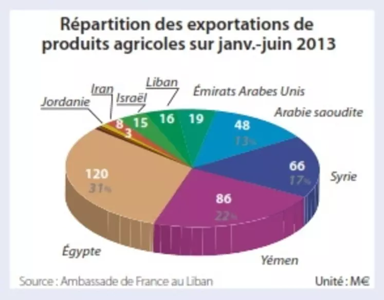 Sur le premier semestre 2013, les ventes agroalimentaires de la France au Proche et Moyen-Orient étaient constituées à 35 % de produits agricoles (386 M€, +100 % sur un an) et 65 % de produits transformés (741 M€, +5 %), selon l’ambassade de France au Liban. Cette zone représente le 2e débouché hors UE pour les produits agricoles français (14 %), derrière le Maghreb (37 %) et au niveau de l’Afrique subsaharienne, et le 3e pour les produits alimentaires transformés (10 %), derrière l’Amérique du Nord (21 %) et la Chine (15 %). Avec une valeur de 1.127 M€ (+25 %), les produits agroalimentaires y représentent 15 % de l’ensemble des produits exportés par la France (+3 % de part de marché sur un an), et cette zone était destinataire de 11 % des exportations agroalimentaires françaises hors UE, derrière l’Amérique du Nord (16 %), le Maghreb (13 %) et la Chine (12 %).