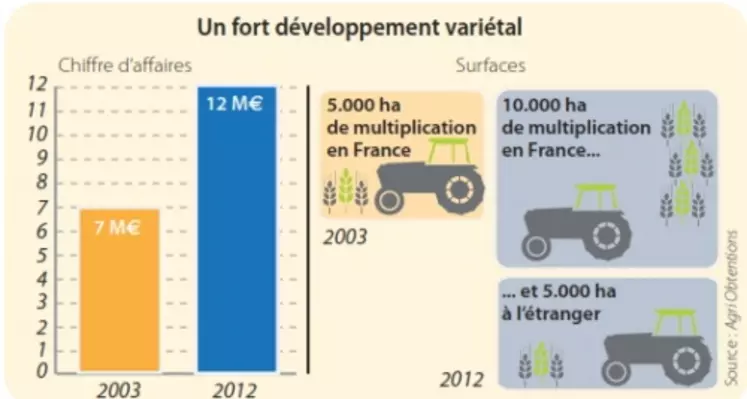 « Si tout le monde surfe sur l’agriculture durable, nous, nous la mettons en œuvre depuis plus de dix ans », assure Louis Forêt, directeur général d’Agri Obtentions (AO), ancienne filiale de l’Inra, désengagé de la sélection et de la création variétale. Pour ses 30 ans, AO entend faire valoir son positionnement de “Semencier de l’agriculture durable”, baseline de son nouveau logo. Pour poursuivre sa croissance (cf. graphique), AO, qui investit 30 % de son CA en R&D, a choisi de structurer son offre selon cinq grands domaines d’activité : Autogames, Gamme bio, Fourragères et couverts végétaux, Filières et Horticoles.