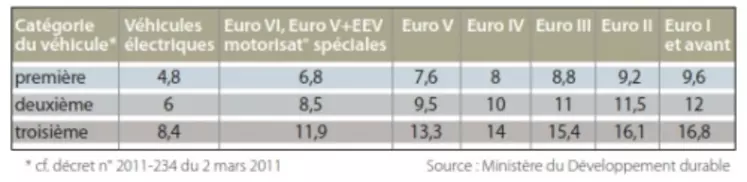 Pour l’heure et afin de « donner la lisibilité attendue par les professionnels », le ministère du Développement durable a publié sur son site, le 21 janvier, le “Barème de l’Écotaxe”, qui donne les « valeurs prévues » de ses taux par catégorie de véhicule, modulés en fonction de leurs performances environnementales (cf. tableau). « Un arrêté sera prochainement publié fixant ces valeurs », indique-t-il.