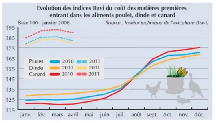 Voilà près d’un an que les filières volailles voient leurs coûts de production s’envoler, tirés à la fois par l’augmentation significative du transport mais aussi par le net redressement des prix de l’aliment. Selon les dernières données de l’Institut technique de l’aviculture (Itavi), l’indice du coût des matières premières entrant dans l’alimentation des volailles de chair a augmenté de 37 à 57 % entre avril 2010 et avril 2011, selon l’espèce considérée. Une envolée qui semble néanmoins ralentir depuis le printemps. Entre février et mars, ces mêmes indices sont restés stables à légèrement haussiers, alors qu’ils étaient en moyenne en hausse de 3,7 % entre janvier et février. En avril, ils repartaient même à la baisse (entre -1,4 et -2,2 %), un mouvement qui ne s’était pas vu depuis le dernier trimestre 2009 !