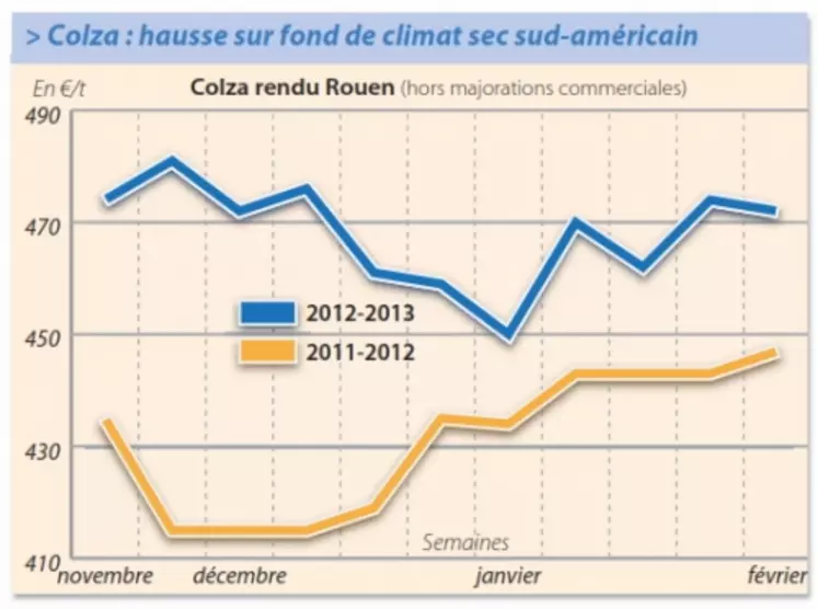 Les cours du colza se sont raffermis sous l’influence de la graine US, alors que l’activité est limitée sur le marché physique français et sur Euronext. De plus, le recul des marges de trituration sur le printemps et la parité euro/dollar défavorable modéraient les mouvements haussiers. Côté fondamentaux, les exportations ukrainiennes de colza 2012/2013 ont été révisées à la hausse par UkrAgroConsult à 1,235 Mt (+5 %). Les semis de canola canadiens pourraient reculer de 10 % à 7,7 Mha en 2013 d’après OilWorld. Les prix du soja ont renchéri suite aux inquiétudes qui planent sur les productions sud-américaines. L’annonce de pluies moins importantes que prévu sur l’Argentine pourrait dégrader les perspectives de rendements. Par ailleurs, la demande reste soutenue. Sur la semaine du 24 janvier, les ventes US hebdomadaires sur la campagne 2012/2013 étaient quasi stables à 386.000 t. Enfin, les États-Unis craignent toujours d’être rapidement à court de marchandises. Les cotations du tournesol se sont appréciées à l’instar du complexe oléagineux.