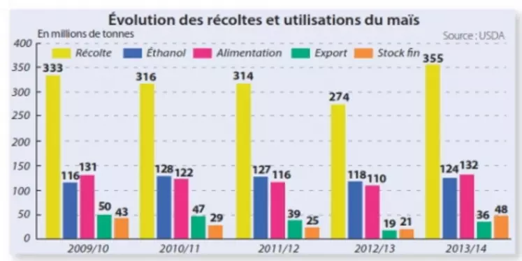 Le bilan mondial en maïs est lourd du fait de la production US 2013 qui affiche un record de 355 Mt, avec des stocks de fin de campagne 2013/2014 estimés à 48 Mt, soit quasiment +30Mt par rapport à 2012/2013. Les prix US ont chuté à environ 4 $/boisseau, et « rien ne devrait les faire remonter notablement sur le moyen terme. La hausse de la production US va largement compenser le repli du disponible exportable sud-américain. Ce sont les semis US au printemps, qui vont être déterminants pour l’évolution des cours. Sachant qu’avec les prix actuels, nous pensons que les surfaces vont baisser au profit du soja. »