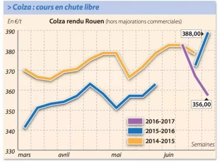 Les cours du colza s'effrittent dans le sillage du soja sur Chicago et de l'huile de palme. Et ce, malgré le renchérissement du pétrole sur le marché mondial. Les cours du soja à Chicago ont baissé suite à la publication de prévisions météorologiques américaines favorables aux cultures aux États-Unis. Des pluies et des températures moins élevées sont attendues d'ici lundi prochain. Les expéditions d'huile de palme ont régressé de 10 % entre mai et juin, ce qui pèse sur les prix du complexe des huiles végétales. Notons que les ventes hebdomadaires américaines de soja se sont élevées à 1.585.000 t, au dessus des attentes des opérateurs. En France, il reste difficile de se faire une idée générale sur l'issue de la collecte colza sur l'ensemble des zones de production Nord et Est, indique Terres Inovia. Parmi les maladies, la cylindrosporiose, observable sur une partie importante de la zone Est (hors Rhône-Alpes), va influer les rendements de certaines parcelles. Les ravageurs, tout particulièrement ceux d'automne (altise et charançon du bourgeon terminal), vont être source de baisses de rendement plus ou moins marquées. L'activité est calme sur l'ensemble du marché. Concernant le tournesol, la régularité de peuplement et les stades des cultures sont toujours très hétérogènes. Les surfaces foliaires sont plutôt faibles et limitantes à ce jour en raison des conditions météo et des pucerons verts. L'activité est calme sur le marché du colza comme du tournesol. En tourteaux, bien que les cours aient baissé sur le marché français, ils restent à des niveaux élevés, ce qui ne déclenche pas de couvertures sur l'éloigné. Seuls quelques compléments sur le disponible sont enregistrés. Sur le marché américain, les cours des tourteaux de soja se sont repliés. Les fonds d'investissements sont vendeurs sur le marché.