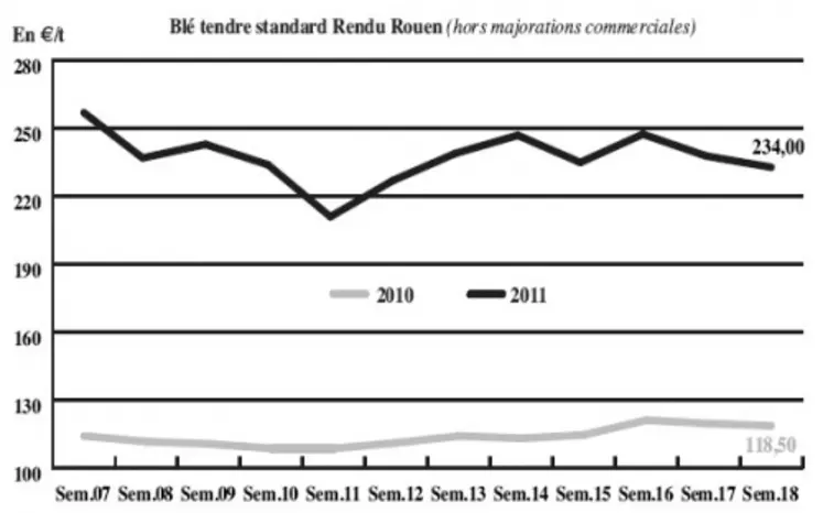 Quant aux orges brassicoles, les OBH sont incotées en ancienne récolte et baissières sur la nouvelle campagne, alors que les acheteurs y refont leur apparition. En OBP, les cultures souffrent de la sécheresse, creusant l’écart entre orges de mouture et brassicoles. Ces dernières continuent de renchérir sur les trois campagnes cotées. Face à cette tendance persistante à la hausse, des affaires se sont traitées sur la campagne 2011/2012 en début de semaine. Le marché est aujourd’hui inerte.