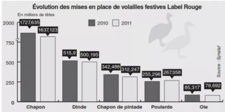 Du côté de la production, l’année 2012 s’annonce peu évolutive comparé à 2011. L’an dernier, les filières avaient freiné leurs mises en place, en raison de la crise économique et d’un calendrier peu favorable (Noël et Nouvel An tombant des dimanches). Cette année, en l’absence d’amélioration de la conjoncture, la prudence est restée de mise, malgré un calendrier plus encourageant. Selon Marie Guyot, directrice adjointe du Synalaf, « la tendance est au maintien des mises en place pour les volailles Label Rouge dans leur ensemble. De petites évolutions sont néanmoins à signaler en fonction de l’espèce considérée : il y aurait eu cet été une légère progression des mises en place de chapon et de poularde, alors que celles de dinde et de pintade auraient plutôt tendance à se tasser » par rapport à leur niveau de 2011.