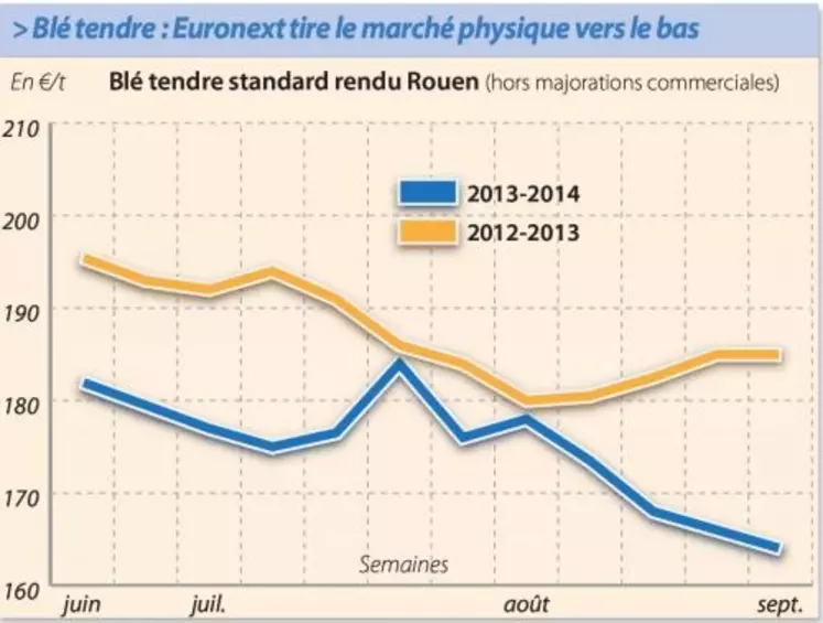 Les meuniers semblent se faire un peu plus présents cette semaine, avec une meilleure visibilité sur les qualités disponibles en blé tendre. La diversité des qualités complique toujours les transactions dans les régions les plus touchées par les problèmes de temps de chute d'Hagberg. Dans le Centre-Est, les vendeurs cherchent à faire de la place dans les silos pour les futures récoltes. Le marché est donc particulièrement offert sur septembre-octobre, notamment en blé fourrager. Dans le Sud-Ouest, on note tout juste quelques mouvements sur le rapproché en blé meunier. Les minotiers espagnols semblent pour le moment couverts. De petits retards d'éxecution sur juillet-septembre sont à signaler. D'une manière générale, les fabricants d'aliments du bétail ne se montrent pas pressés de passer commande, attendant l'effet baissier de l'arrivée des maïs notamment. Des transactions se concluent tout de même sur le rapproché. Dans le Sud-Ouest, la demande des Fab serait potentiellement présente de l'autre côté des Pyrénées pour du court terme, mais l'offre de blé fourrager est réduite. De son côté, l'activité en portuaire se montre assez dynamique. Notons que les offres françaises et roumaines ont été retenues par l'Égypte dans le cadre d'un appel d'offres portant sur 120.000 t (60.000 t pour la France), pour des livraisons début octobre. Le made in France a su se montrer plus compétitif que l'origine russe ou ukrainienne. Les prix sont dans l'ensemble orientés à la baisse, dans le sillage des marchés à terme, suite à la signature du cessez-le-feu russo-ukrainien mercredi. L'évolution de la parité euro/dollar est également de nature à rendre les céréales européennes plus compétitives sur la scène internationale. Enfin, l'importance des disponibilités mondiales à venir entretient une ambiance baissière.