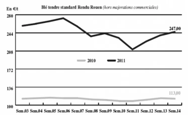Les prix du blé tendre français ont affiché une certaine fermeté cette semaine, tirés par un weather market, reléguant l’actualité internationale au second plan. En Europe, les cultures manquent d’humidité, et ce ne sont pas les quelques pluies constatées ces derniers jours qui suffiront à combler les besoins en eau des cultures. Selon une enquête d’Offre et Demande Agricole, 72 % des blés français sont jugés « bons à excellents » au 5 avril, contre 80 % l’an dernier à la même époque. Les blés moyens s’affichent à 23 % (19 % en 2010), les mauvais à 1 % (4 % en 2010), et les très mauvais à 1 % (0 % l’an dernier). Aux Etats-Unis, la situation est également préoccupante avec des blés d’hiver US estimés bons à excellent pour seulement 37 % contre 65 % l’an passé. D’autre part, en Ukraine, la société UkrAgroConsult a évalué la récolte de céréales 2011 à 44,72 Mt contre 46,88 Mt en 2010, dont 20,5 Mt de blé. Par ailleurs, l’activité sur le territoire français est limitée et a même reculé sur les places portuaires où les primes ont affiché un retrait. La nutrition animale procède à quelques achats pour des livraisons rapprochées.