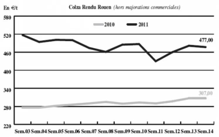Les cours du colza ont fléchi d’une semaine sur l’autre, après s’être ponctuellement renchéris à la parution des chiffres de semis de soja américains jeudi dernier. Le département à l’Agriculture a en effet revu à la baisse de 1 % les ensemencements de fèves aux Etats-Unis pour la récolte 2011, à 31 Mha. De plus, les stocks locaux (33,9 Mt) se révèlent inférieurs de 2 % à ceux de l’an dernier à la même époque. Cependant, l’amélioration de la météorologie en Amérique du Sud a permis la reprise des chantiers de récolte de soja, ce qui a conduit à une détente des cours. Les récoltes s’élèveraient à 72 Mt au Brésil et 50 Mt en Argentine. En Europe, le gel aurait affecté les cultures de colza polonaises et allemandes. La production germanique reculerait de 5,5 % sur un an, selon certaines sources. Côté activité, la demande est moins présente car les besoins sont couverts. Les cours de l’huile de colza se raffermissent, dans le sillage de la palme. Ceux du tournesol, stationnaires jusque-là, ont tendance à monter.