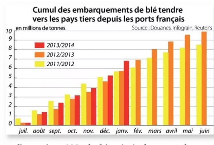 Suite à la révision du cahier des charges égyptien – les autorités ont décidé de ne plus tolérer le taux d'humidité de 13,5 % et de n'accepter qu'un pourcentage maximum de 13 % – les opérateurs ont revu leurs objectifs sur l'Égypte à la baisse. « Il y a actuellement 660.000 t dans les carnets. Il devrait y avoir moyen d'aller plus loin, mais plus d'atteindre les 1,2 Mt qui était un peu le chiffre consensuel dans la filière », notait Olivia Le Lamer, responsable de l'unité Grandes cultures chez FranceAgriMer (FAM), lors du point presse du conseil spécialisé Céréales du 12 février. Néanmoins, FAM maintient son objectif de 11,5 Mt vers pays tiers. En effet, la demande reste très dynamique sur l'Algérie, « où la France n'a quasiment pas de concurrents cette campagne. Au 31 janvier, nous avions déjà expédié 3,4 Mt, soit l'équivalent des volumes pour la totalité de la campagne 2012/2013. » De plus, il y a eu 900.000 t de flux récents vers le Maroc à la faveur de la mise à 0 % des droits de douane sur les importations de blé tendre depuis le 1er janvier jusqu'à fin avril. Certains espèrent une extension de cette période et davantage d'opportunités pour la France. Toutefois les problèmes de déchargements actuels (cf. article ci-dessous) pourraient limiter de futures ventes. Le stock final est relevé de 160.000 t à 2,85 Mt, du fait de moindres exportations vers l'UE (-235.000 t).