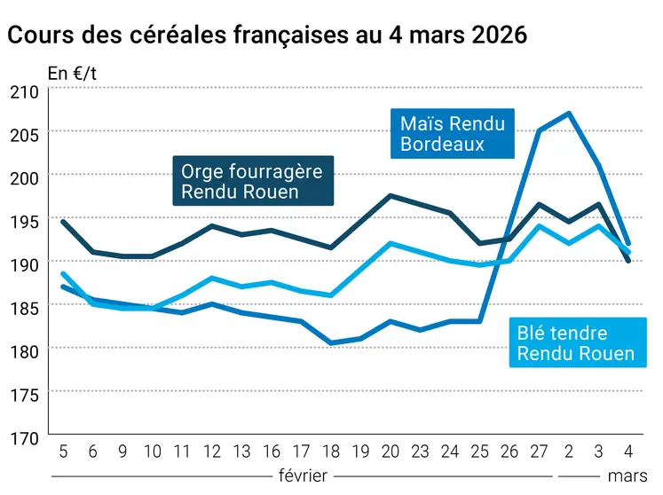 Les prix du blé sur Euronext ont suivi une tendance baissière sur l’ensemble des échéances ouvertes (entre 0 €/t et -4,50 €/t) entre le 3 et le 4 mars 2026, en raison du renchérissement de l’euro face au dollar. On enregistre -4,50 €/t sur l’échéance mars 2026, -3,75 €/t sur l’échéance mai 2026 (la plus travaillée), -3,25 €/t sur l’échéance septembre 2026 et -2,75 €/t sur l’échéance décembre 2026. Après une poussée de fièvre vendredi dernier, les cours évoluent depuis dans des marges étroites, les opérateurs étant dans l’expectative : le conflit iranien va-t-il durer ? Avec quels impacts sur les coûts logistiques, la disponibilité et les prix des céréales et autres engrais ? On enregistre une bonne demande à l’international, marquée par l’appel d’offres égyptien. Cependant, l’origine européenne est trop chère par rapport aux marchandises du pourtour de la mer Noire. Dans le dernier rapport hebdomadaire de positions des traders d'Euronext, au vendredi 27 février 2026, les opérateurs dits financiers (c’est-à-dire l'ensemble des catégories excepté les entreprises commerciales) ont diminué leur position nette courte sur le blé (d'environ 58 300 lots) pour atteindre environ 20 600 lots.