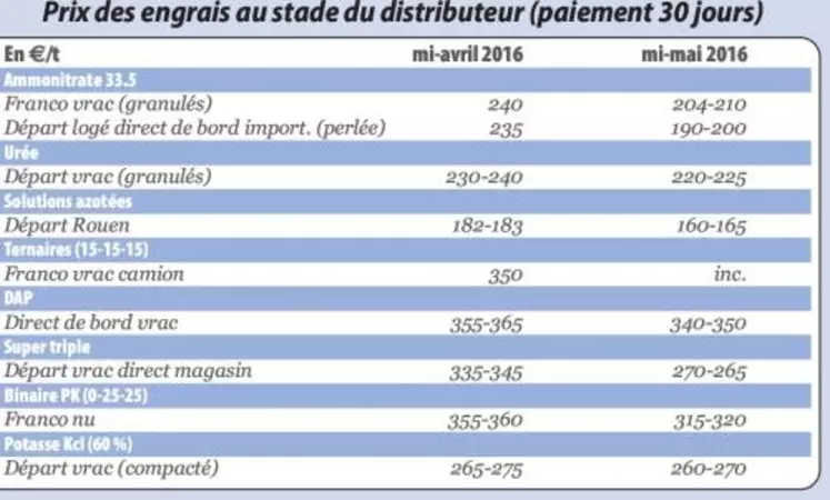 La nouvelle campagne des engrais azotés démarre avec des prix qui continuent à reculer, pour s'ajuster à la dégringolade des cours des matières premières ces derniers mois, notamment du pétrole et du gaz. Les producteurs d'ammonitrate ont donc fixé des prix en repli significatif de plus 80 euros la tonne par rapport à ceux de l'an dernier, un niveau jamais atteint depuis janvier 2009. L'objectif est également de contrer la progression de l'urée. Les conditions tarifaires plus favorables de l'ammonitrate stimulent le marché, même si certains distributeurs restent prudents sur leurs prises de position, qu'ils limitent dans l'attente de meilleures concessions. Ce, d'autant plus que l'urée reste très intéressante, avec des prix sur le marché à terme proposés à 205-210 euros la tonne de juillet à décembre. Le réajustement des cours touche aussi le Super triple d'origines bulgare, israélien ou marocain, dont les prix ont plongé, rendant le marché très actif. La nouvelle campagne démarre également à la baisse pour les binaires, avec un marché demandeur en cultures industrielles mais poussif chez les céréaliers, peu portés sur les achats en raison de la mauvaise rémunération de leurs productions. Même tendance pour la potasse, dont la consommation a régressé de 10 % par rapport à la campagne précédente.