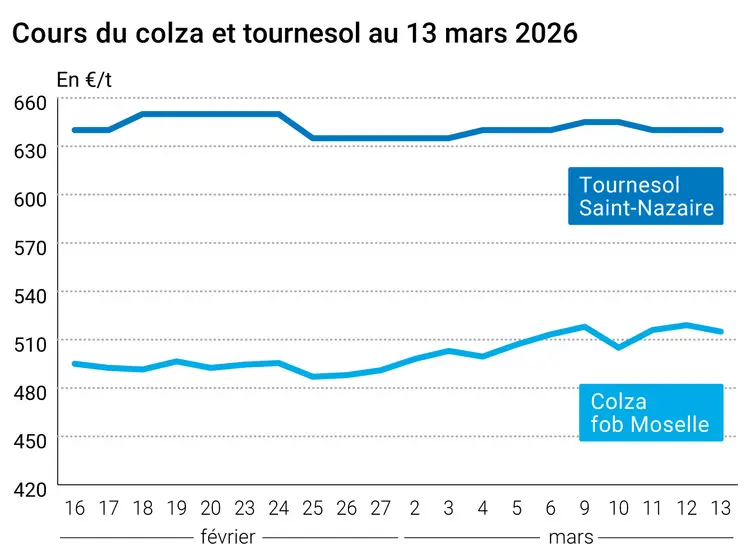 L’évolution des prix du colza et du tournesol français entre le 12 et le 13 mars 2026, expliquée par La Dépêche-Le Petit Meunier.