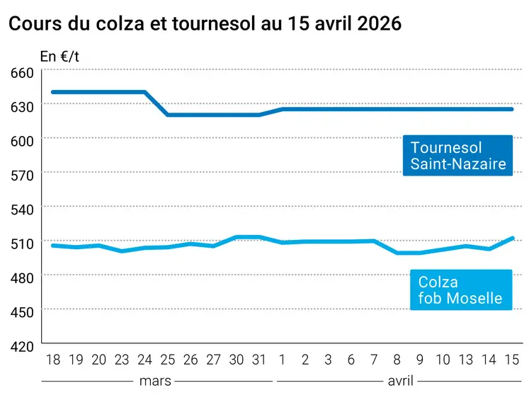 L’évolution des prix du colza et du tournesol français entre le 14 et le 15 avril 2026, expliquée par La Dépêche-Le Petit Meunier.
